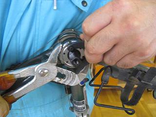 BB(ボトムブラケット)の締め付けナットはウォーターポンププライヤで外した。