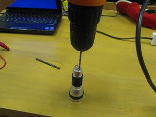 電池を抜いて、ドリルで穴を開けたところへコードを通して、外部から電源供給ができるように改造。
