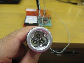 先日試してみたLEDへ流す電流をトランジスタで増幅する方法に従い、明るいLEDライトを接続してみた。