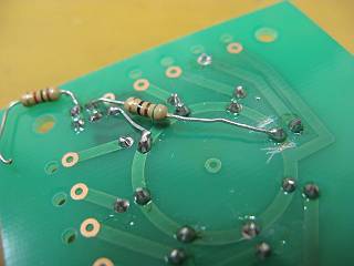 裏側の様子。前回と同じく、ベース側に1kΩ、コレクタ側に51Ωの抵抗を入れてみた。