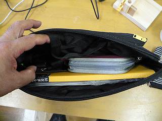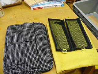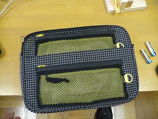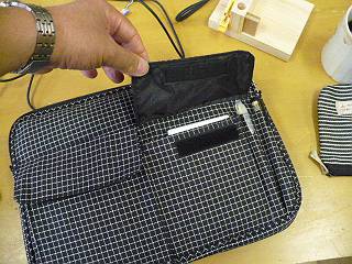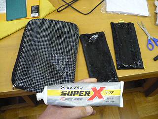 今までのバッグに縫い付けていたメッシュケースを今回は接着剤で固定した。