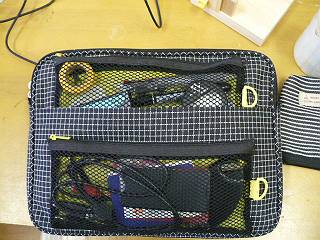 使用中の状態。できるだけ厚さが広がらないように一面に持ち物を広げて収納できるようにした。
