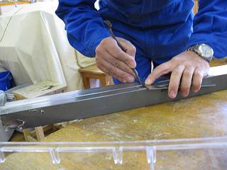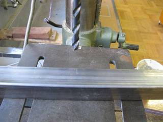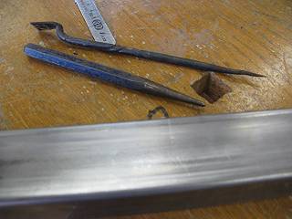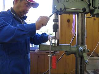真ん中の部分にネジ止め用の穴を開ける。まずはけがいてから、ボール盤で穴あけ。