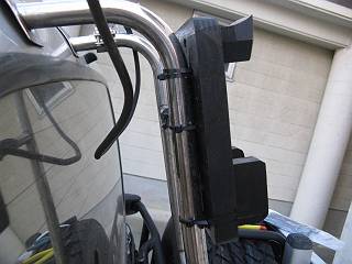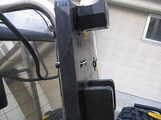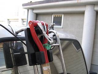スコップを取り付けたところ。ラダーの柱に沿わしたので後方視界も大丈夫。
