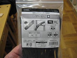 塗装して穴を開けてからラダーに固定。今回は耐候性のあるロックタイを使用。3.8mm幅、100本入りで148円。