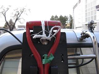固定の様子。上下の部分は2本で留めてある。走行中にスコップを落としたら大変なことになるから。