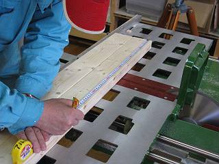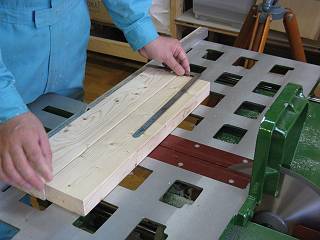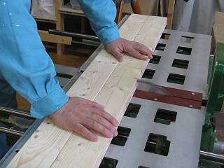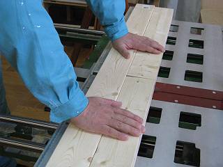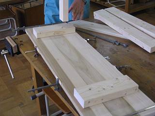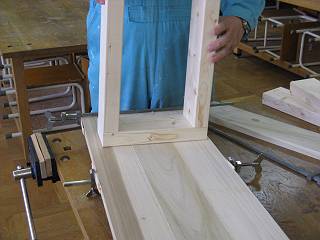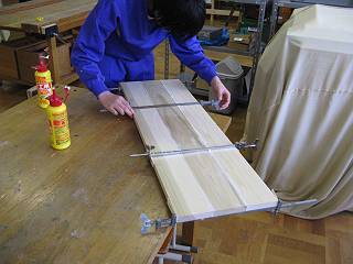 まずは天板を接着。板の組み方(材の見立てや木目方向)。ハタガネの使い方など。
