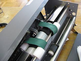 紙送りのベルトが外れているだけだが,中のプーリーが複雑なので,一通り分解しないと修理できないようだ。