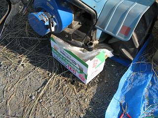 オイル排出中。初めて市販の廃油処理箱を買ってみた。排出口の上にある水抜きタンクが空なのはここもクリーニングしたため。