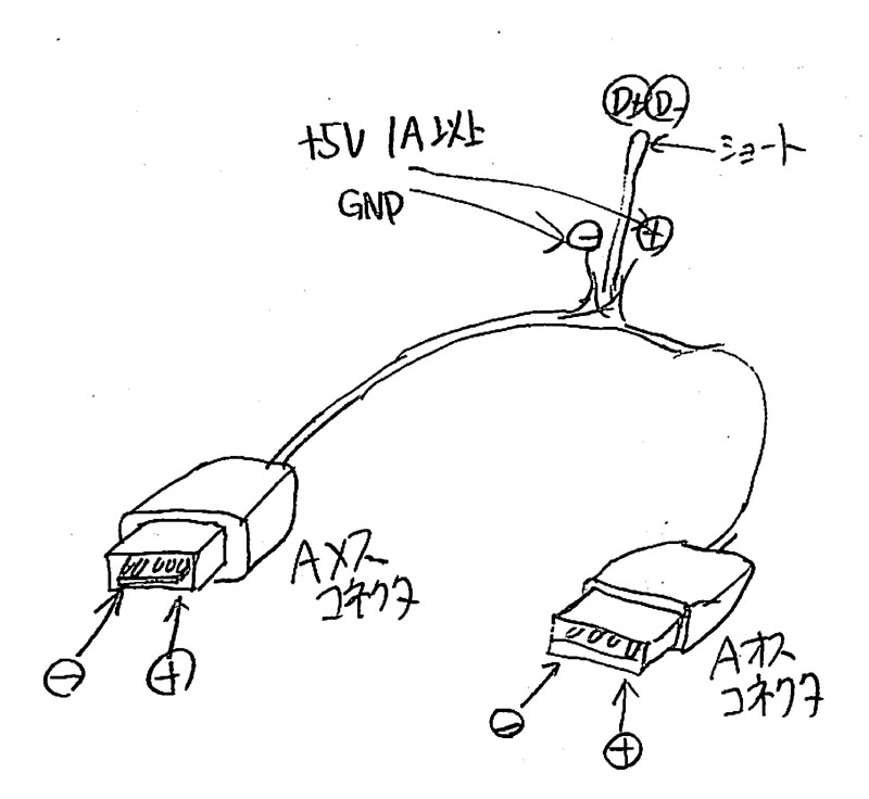 というハードルがある。そこで,USBの延長ケーブルを加工して間にDCコネクタを入れて汎用の電源を接続できるように考えた。