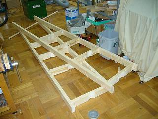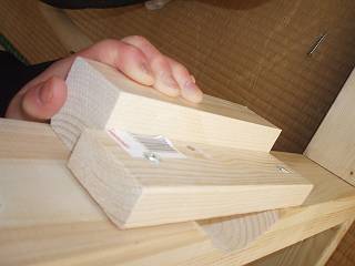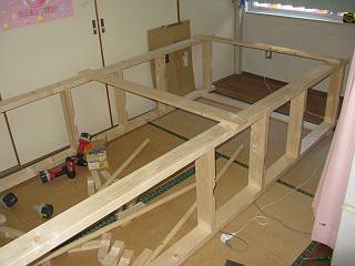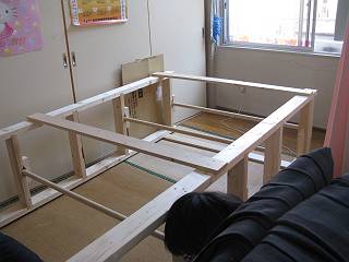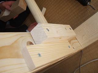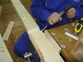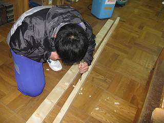 はしごを2つ作成して間をつなぐ構造にしたために、溝を引いてのみで仕上げる。ほおっておくと生徒によってはまだ床に傷をつけるような作業をしてしまうんだなぁ。