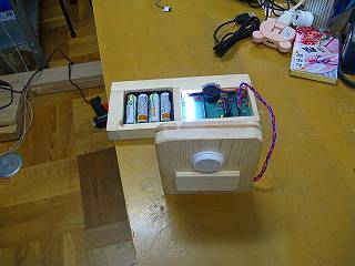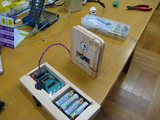 こんな形で使用テスト,レンズがあるので10m先の直径1mくらいの範囲を監視できる。