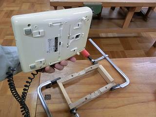 手押しで基準面を作って、自動かんなで角材にした。それを電話のカーブに当てて、出っ張ったところを受ける穴を開けた。