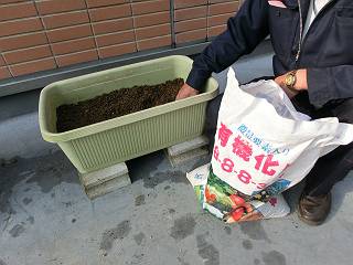 プランターの土には元肥が入っていると書いてあるが、化成肥料も一緒に混ぜてみた。