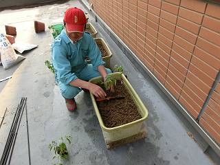 土は、プランターで野菜や花を育てるために販売されているものを使うことにした。