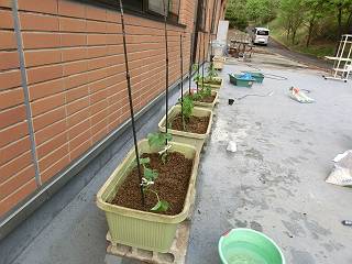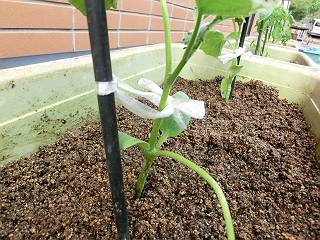 もう苗は大きくなっているので、支柱を立てて誘引する。