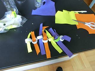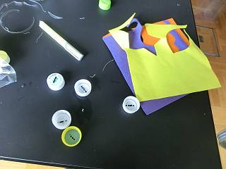 教材に付いてきた外側の紙をコピーして巻いて並べてみた。外のプランタートマトは、そこそこ順調に実を増やしている。
