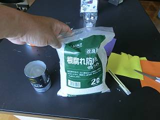 空き缶の一番低いところに穴を開けなかったので、底にはゼオライトをひいてから土を入れた。