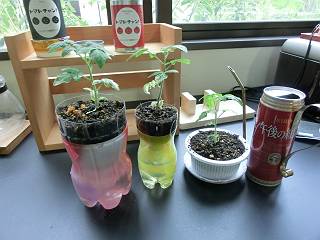 その後、種を播いたキュウリと水菜の芽が出てきたり、以前分けておいた教材用のトマトも大きくなってきたりと、ちょうど良かったので鉢を作ってみた。