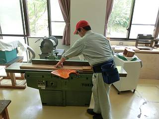 テーブルの天板にするために板をはぐ。木裏が上になるように背中合わせで削ってから2枚をあわせる。