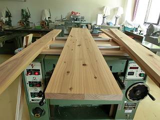 手押しをかけて基準面を出し、自動鉋盤で厚さをそろえる。さすがにスギは反りやすいので、24mmまで削ってそろえた。