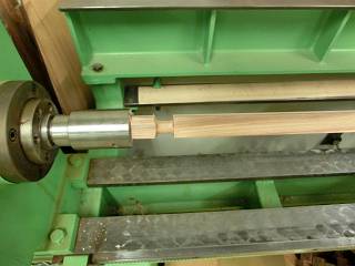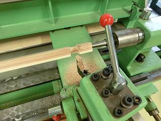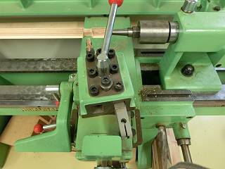 当初は、木工レース用のバイトを使っていたが、直角が出ないので金工旋盤用の突っ切りバイトを取り付けたらうまく削れた。