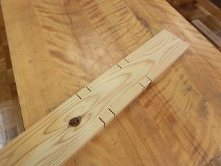 スギは針葉樹で柔らかいので、どっしりとした家具には向かないから造作用の材料としてラフな机にする。