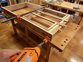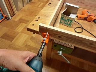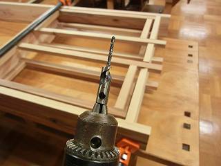 ボンドをつけてハタガネで締めた後で、2段錐にて下穴を開けてからコーススレッドで留めることにした。