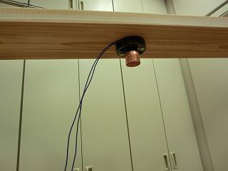 LED電球を使うことにすれば10wもないので、細いコードで大丈夫。ホットボンドで固定した。