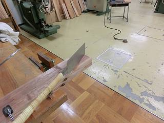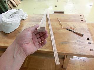 補強のために角に溝を入れて、のこぎりと同じ厚みの板を入れる。