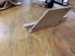トリマーで縁枠を飾ってから、マイタゲージを45度にして角を落とす。