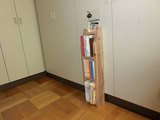 できあがりに、写真立ても取り付けて、本なども入れて見た。今日はここまでだが、こちらはワックスでの塗装にしてみる。