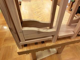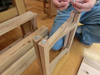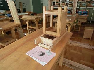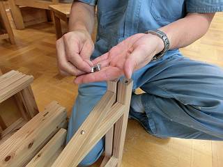 上の折りたたみ椅子部分、だぼ接合だが、位置決めのための治具も持参なさっていた。