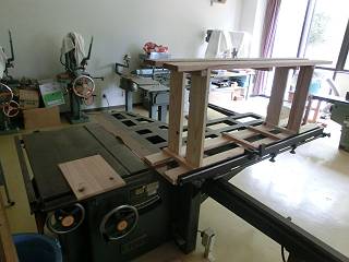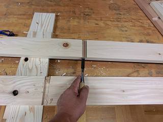 手押し鉋と自動鉋で材をそろえてから上下2カ所に溝を切って枠にする。