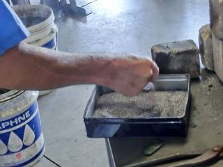 ブラスト後、砥の粉を全面に塗って乾かす。これで均一に焼き入れ>冷やしができる