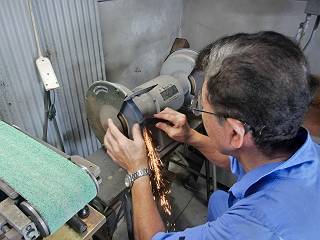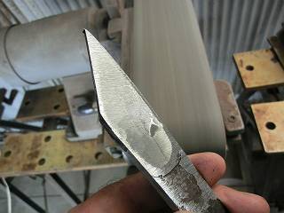 グラインダーで、削って好きな形を作り出す。この後、焼き入れもあるので、結構厚めに仕上げる。