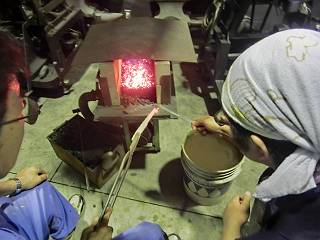 焼き入れ作業、850度〜900度。磁石につくかどうかという基準もあるが、最後は師匠の「はい、今だ」の一言。
