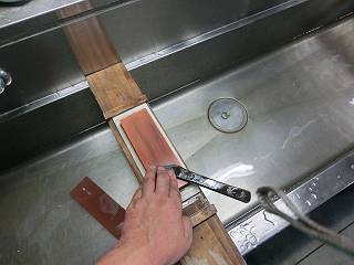 この後すぐに、焼き戻しをする。焼き戻しは、落とした水滴がなじまずにはじけるとき。180度。