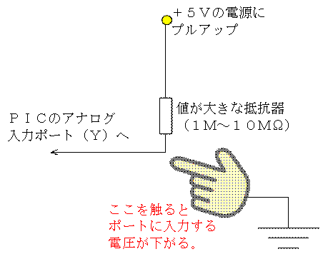 このような形で、アナログポートにかかっている電圧が、人が触れることで変化する。