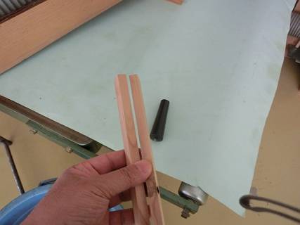 2本の板材をベルトサンダーで削って大きな洗濯ばさみのような設計にした。