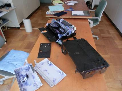洗った後のプリントヘッド。そのほかのものはプラスチックパネルを細かく切ってプラゴミへ、その他は燃えないゴミに出した。