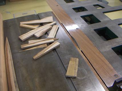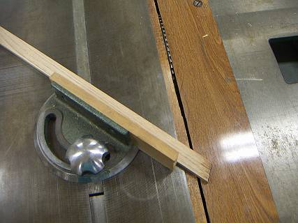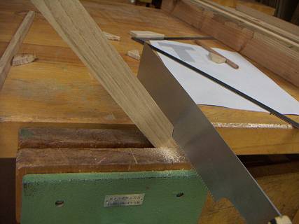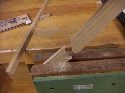 生徒にやらせるなら「とめ」のジグを作ってのこぎりびきでしょうが、ずくを惜しんで丸鋸で切断。