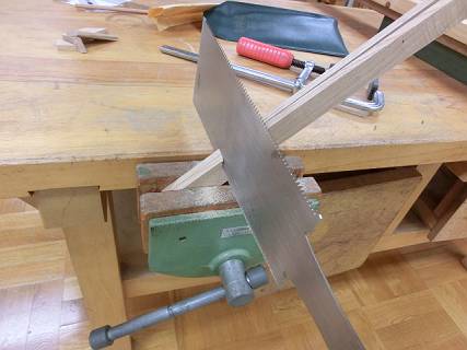 45度の切断を2回やってから、一番難しいのはこの部分でしょう。目的や課題は持たせやすいが、初めてののこぎり引きでやらせることのできる内容ではないかしら。