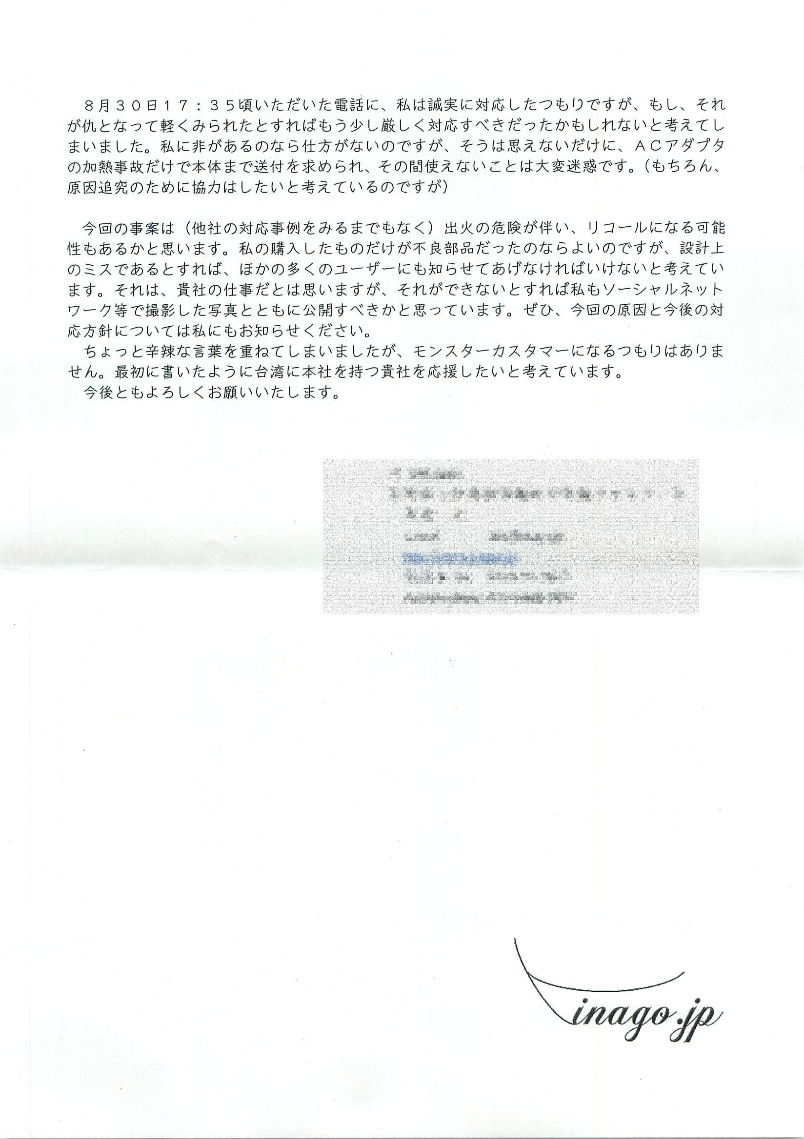 とりあえず,5VのUSB出力できるアダプタはいくつもあるので問題ないのだが,買ってから数日だしなんと言っても他の購入者にとっても危険なのではないかと考えてサポートに電話した。