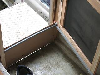 靴を置くためにあえて開口部全てに網戸の長さを合わせずに,下の部分は板をはめ込む形にした。