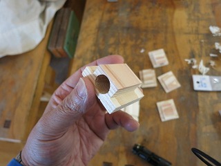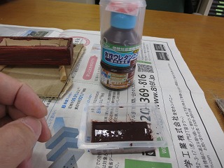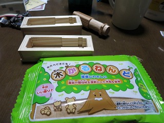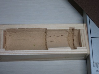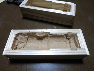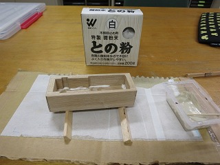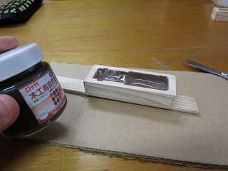 枠を組んだ後,丸いライトが安定するようにフィットする支えを作る。100円ショップで木材の粘土を買ってきた。
