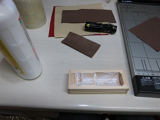 ボンドを塗ってフェルトを敷き,木型を押し込んで接着した後,余分な部分を切り取る。