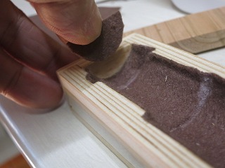 粘土を枠の中に入れて,ビニール袋に入れた木型を押しつけて造形する。