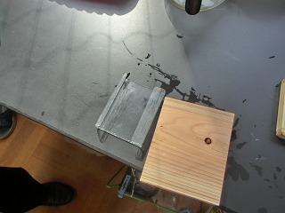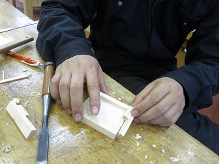 1×4のスプルース材に溝をひいた材を渡し,学生が横切り盤で切断し,のみで加工してケースを作る。