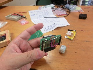 ココナッツのLEDの代わりに端子へ接続する。モーターの電源は電圧が3Vなので単5電池にして背負わせてみた。